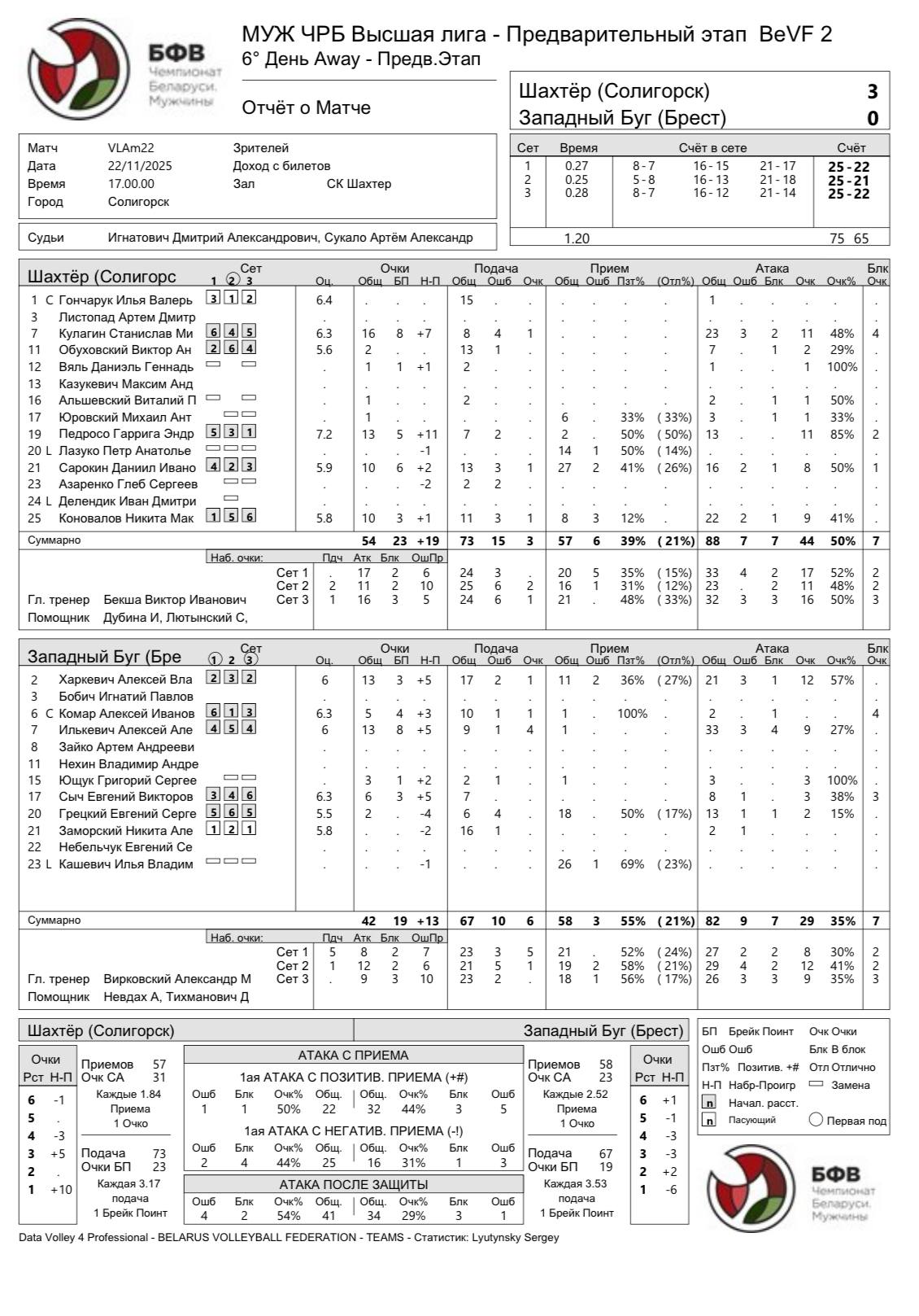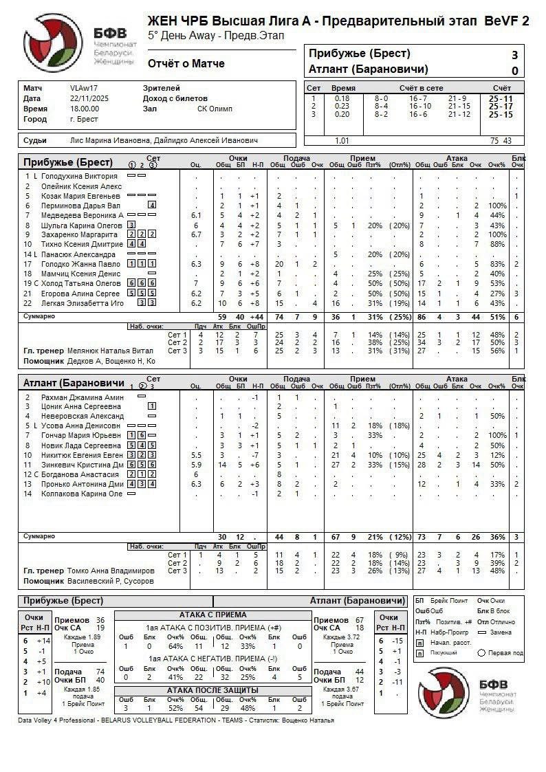 Прибужье одержала уверенную победу над Атлантом со счетом 3:0, став единственной командой тура, добившейся “сухого” результата. С первых минут Прибужье захватило инициативу и уверенно контролировало ход встречи, демонстрируя стабильность на подаче, надежный прием и результативную атаку. У тренерского штаба Бреста была возможность дать важную игровую практику молодым игрокам, а именно доигровщице – Ксении Мамчиц и диагональной – Веронике Медведевой.