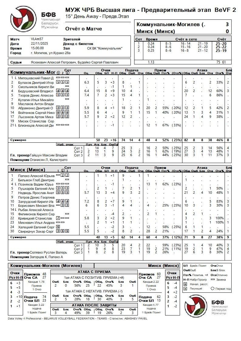 | Минск | 20 | 22 | 19 | 0 | Поражение |
