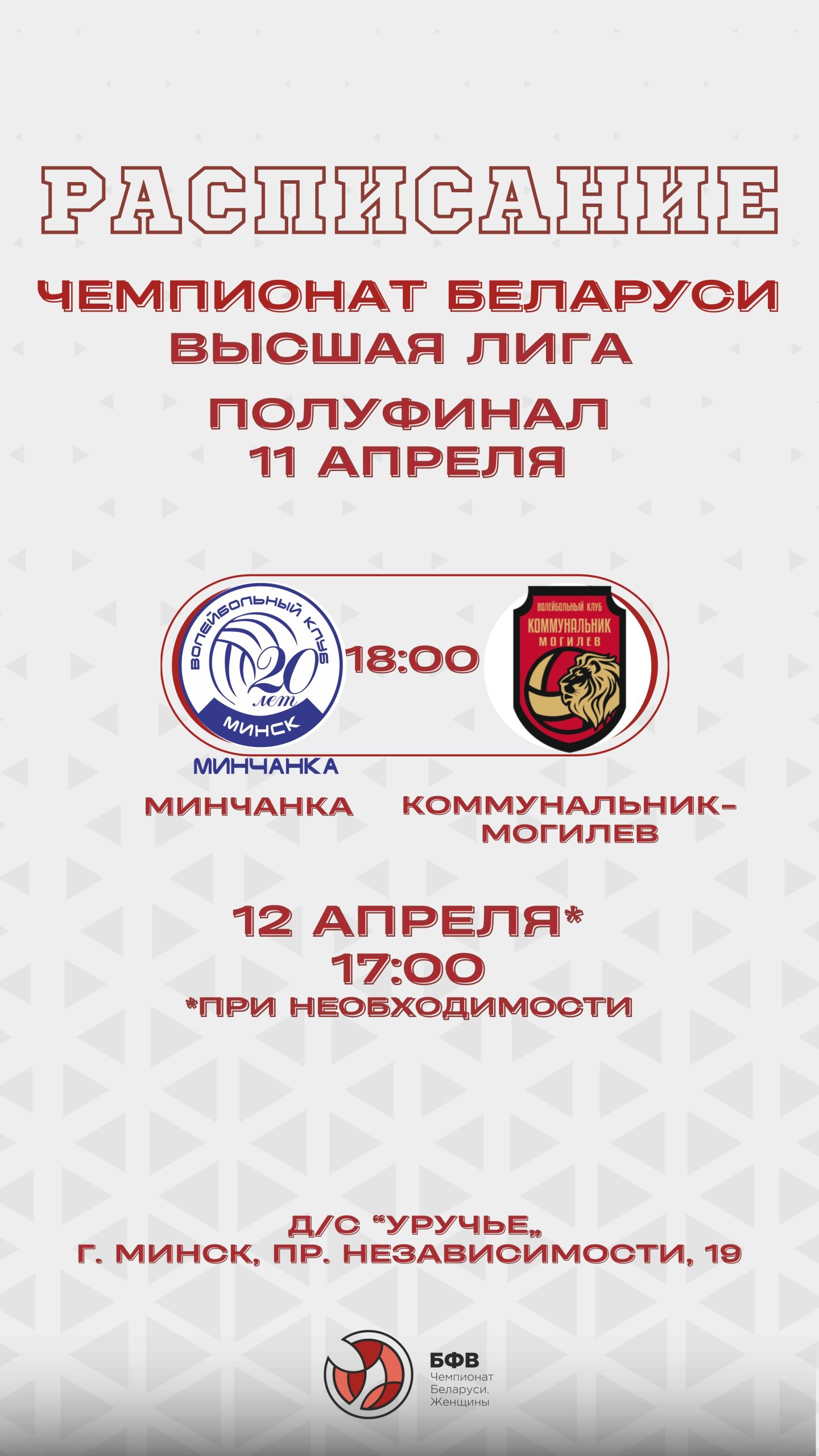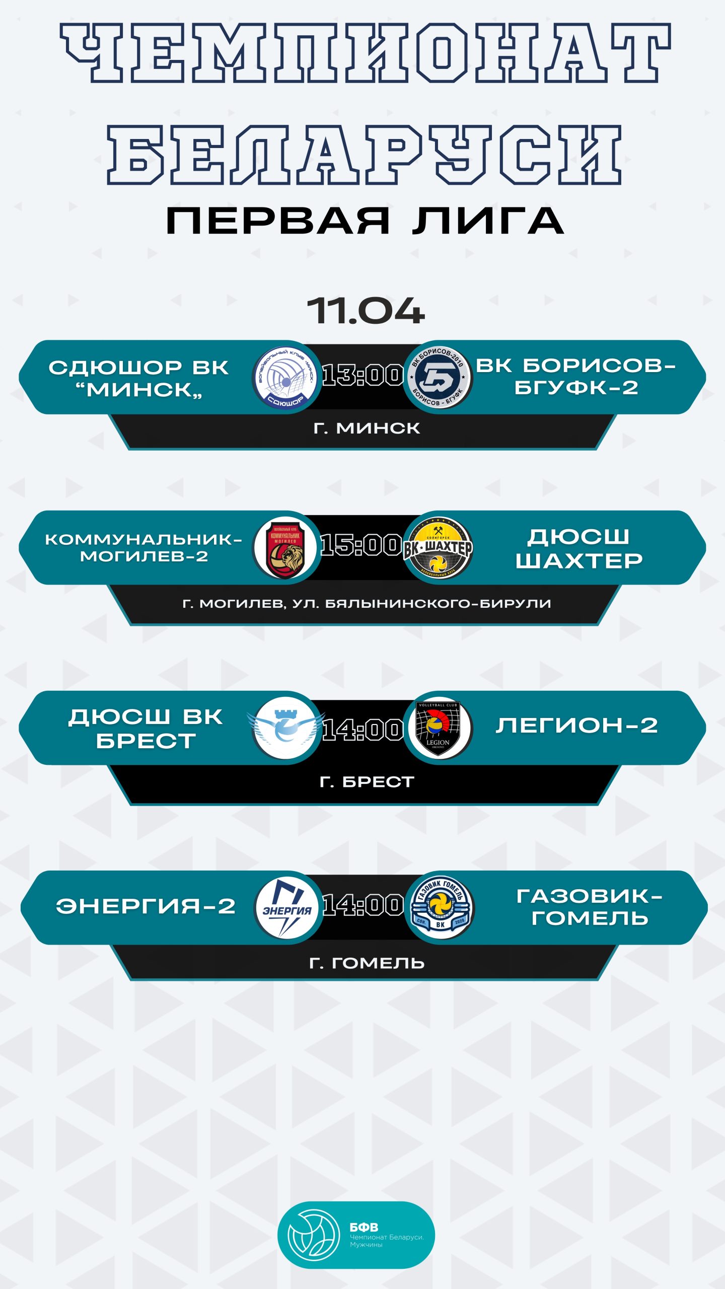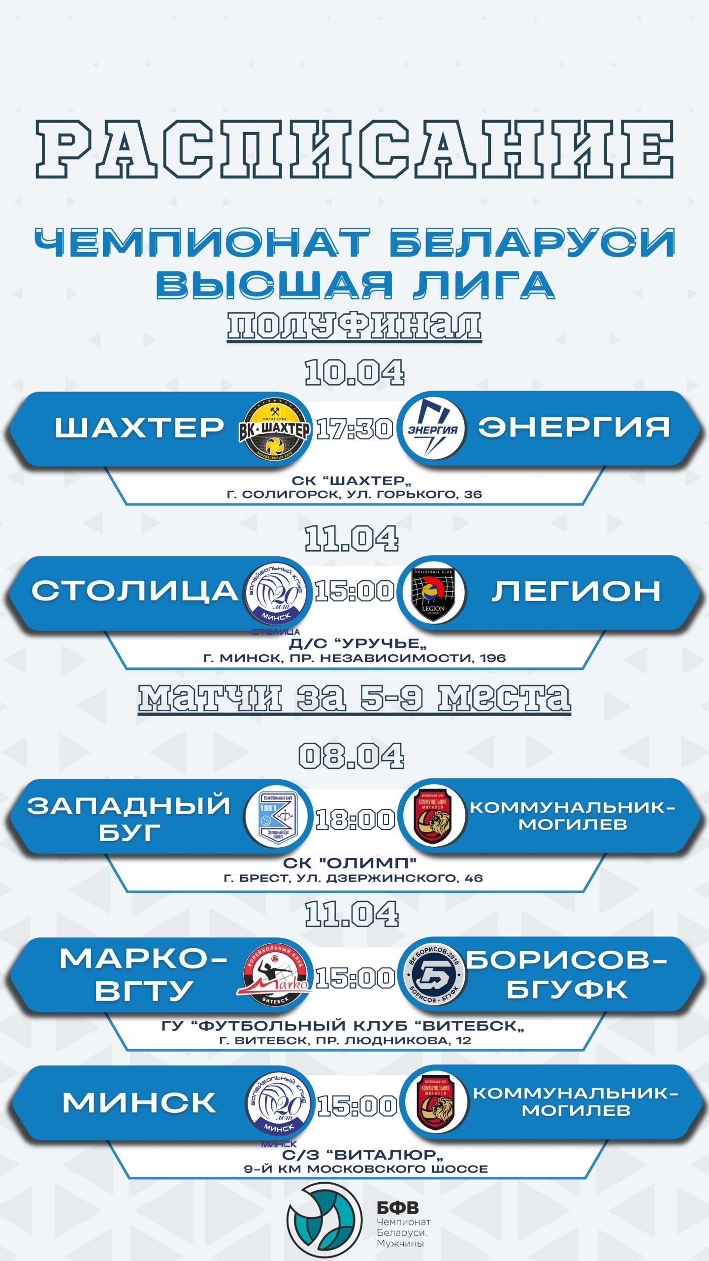 Апр72026Чемпионат РБ Рубрика: Чемпионат РБ07/04/2026Навигация по записямПредыдущаяПредыдущая запись:Высшая лига. Турнирные таблицы 5-9 местаПохожие новостиБезумно насыщенная неделя. Первые финалисты сезона06/04/2026ИСКРА В ФИНАЛЕ06/04/2026АНОНС МАТЧЕЙ31/03/2026Результаты матчей высшей лиги30/03/2026АНОНС ИГР. Полуфиналы Высшей лиги: как устроен календарь и почему он именно такой24/03/2026Итоги матчей 1/4 финала19/03/2026