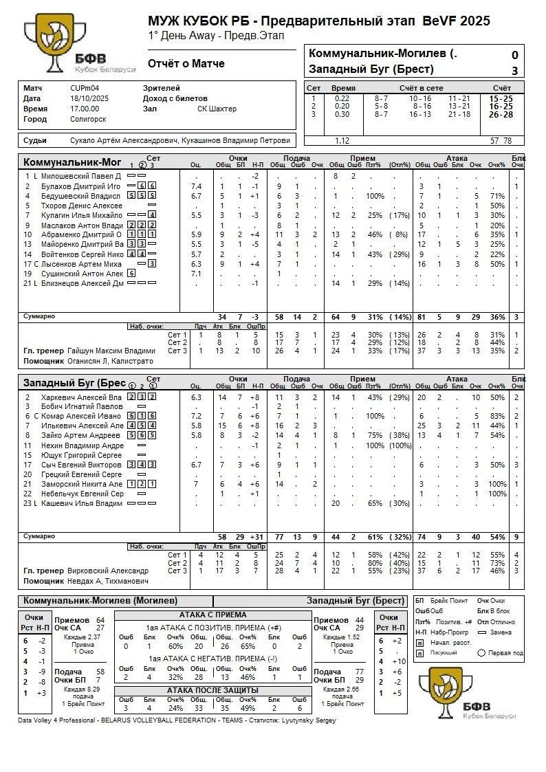 САМЫЙ РЕЗУЛЬТАТИВНЫЙ ИГРОК МАТЧА – Алексей Илькевич (“Западный Буг”; 15 очков; 3 эйса; 44% атака; 1 блок).