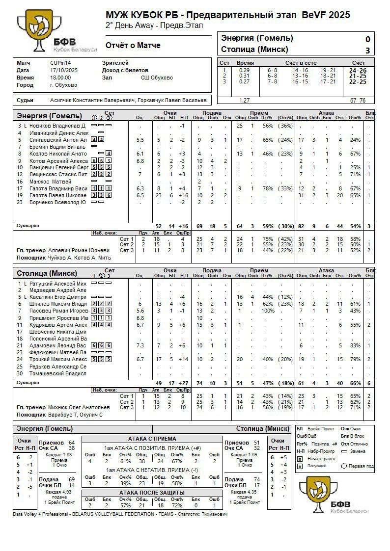 Энергия (Гомель) – Столица (Минск) – 0:3 (24:26; 21:25; 22:25)