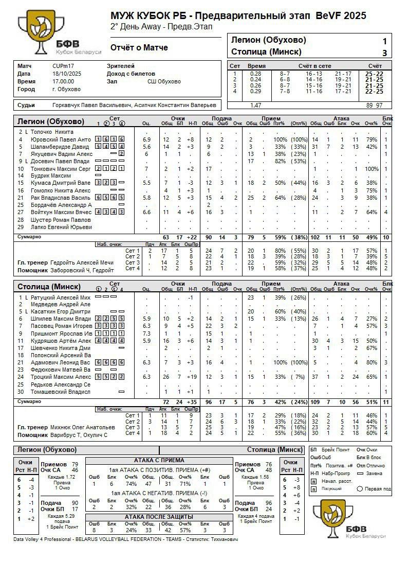 Столица (Минск) – Легион (Обухово) – 3:1 (22:25; 25:21; 25:21; 25:22)