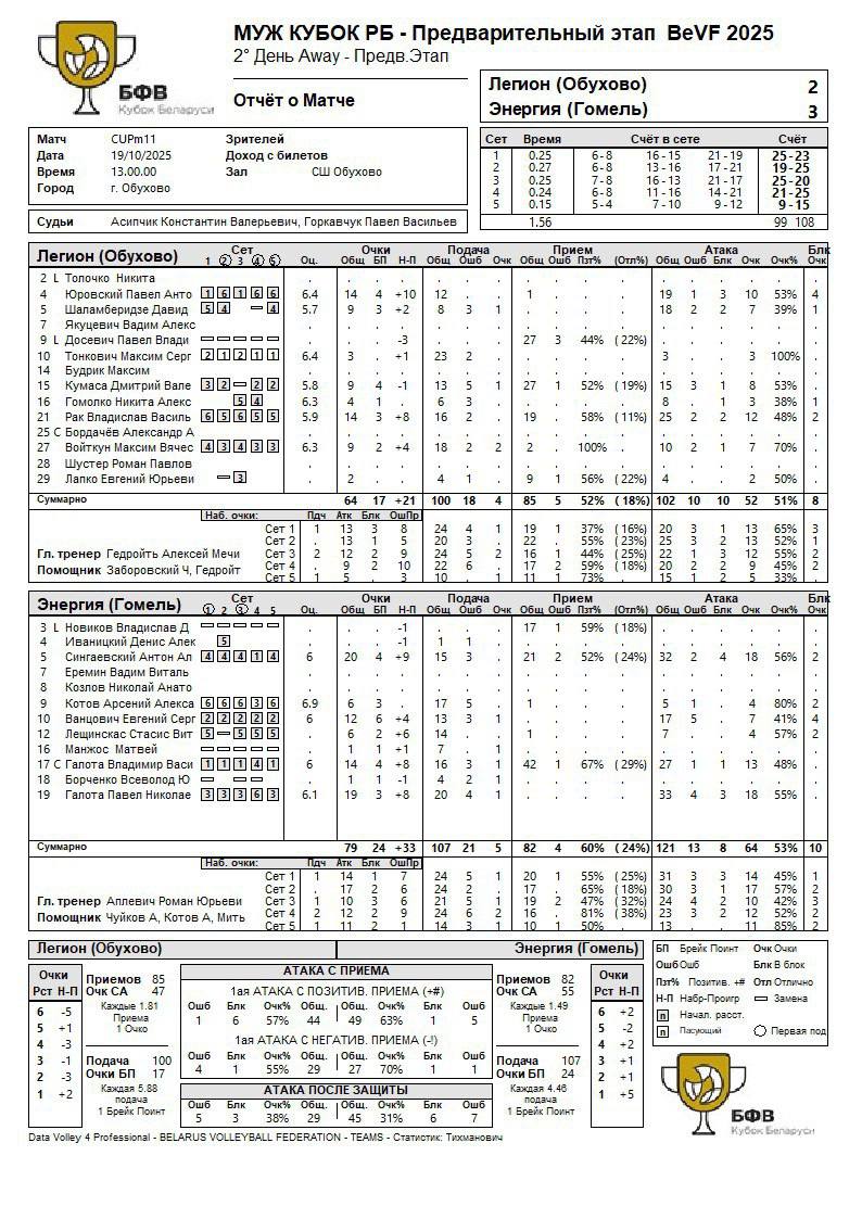 Легион (Обухово) – Энергия (Гомель) – 2:3 (25:23; 19:25; 25:20; 21:25; 9:15)